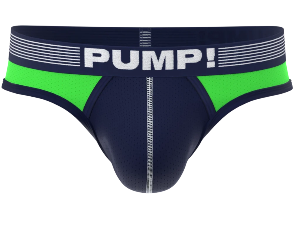 Let your revealing side Surge with this thong. The brief-style silhouette and low-rise fit offer a sleek and eye-catching look while the navy-blue mesh cup, lined with soft cotton, ensures fresh support. Add a touch of color and uniqueness to your wardrobe with the neon green mesh yoke and navy-blue microfiber piping.
